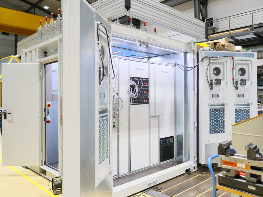 Ein containerbasiertes Energiesystem, das erneuerbare Energie speichert und bedarfsgerecht bereitstellt. Überschüssiger Strom wird per Elektrolyse in Wasserstoff umgewandelt, sicher gespeichert und bei Bedarf wieder in elektrische Energie zurückverstromt. Der dabei entstehende Sauerstoff wird in nachgelagerten Prozessschritten weitergenutzt, z. B. zur Wasseraufbereitung.